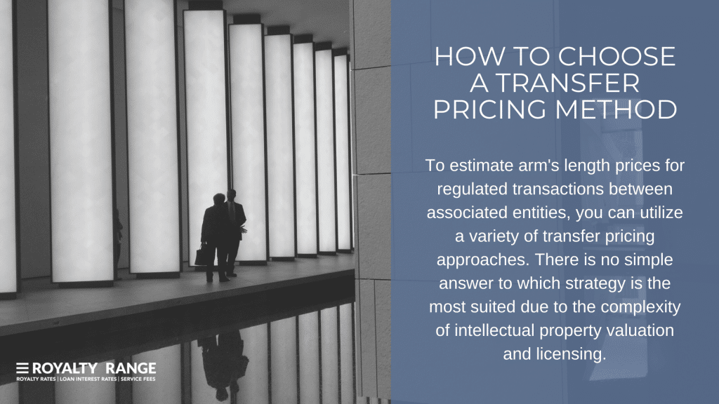 There are a number of transfer pricing methods you can use to determine armâs length prices for controlled transactions between associated entities. Due to the complex nature of intellectual property valuation and licensing, there is no straightforward answer to which method is most appropriate. Choosing a transfer pricing method involves analysing the most appropriate method based on the facts and circumstances of the transaction being analyzed.