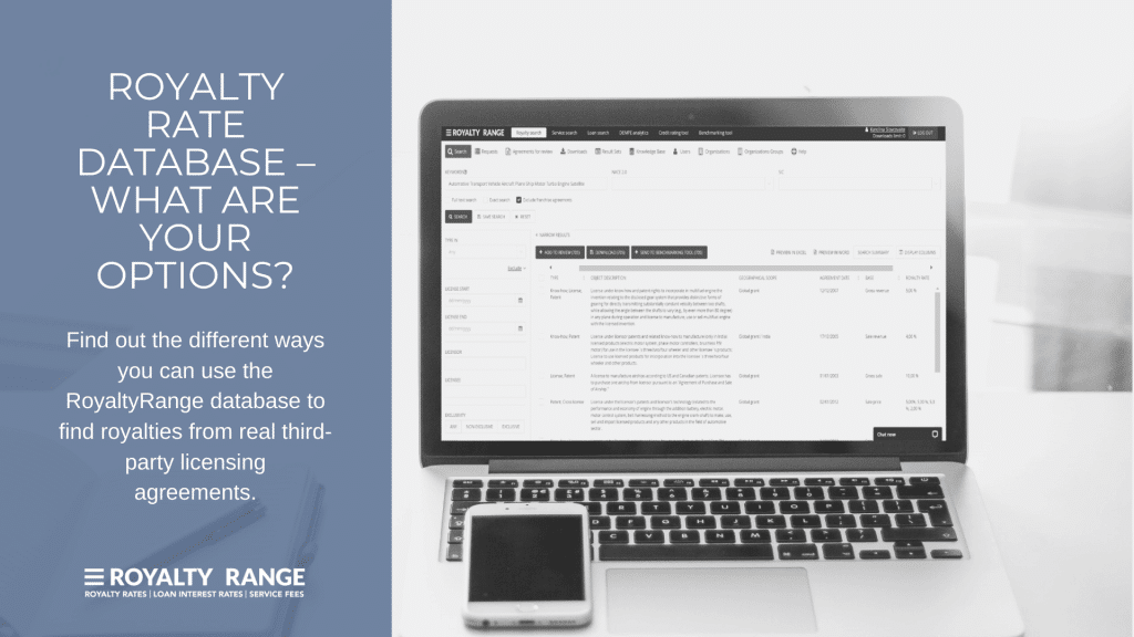 The RoyaltyRange database provides you with quick and easy access to the latest royalty rates from real third-party licensing agreements. Whether you need instant access to market royalty rates or you want us to develop a detailed report of the royalty rate range for your product, you can use our database in the way that best suits you. In this article, we’ll outline the different options for accessing our royalty rate database, helping you choose the option that’s most efficient for you.
