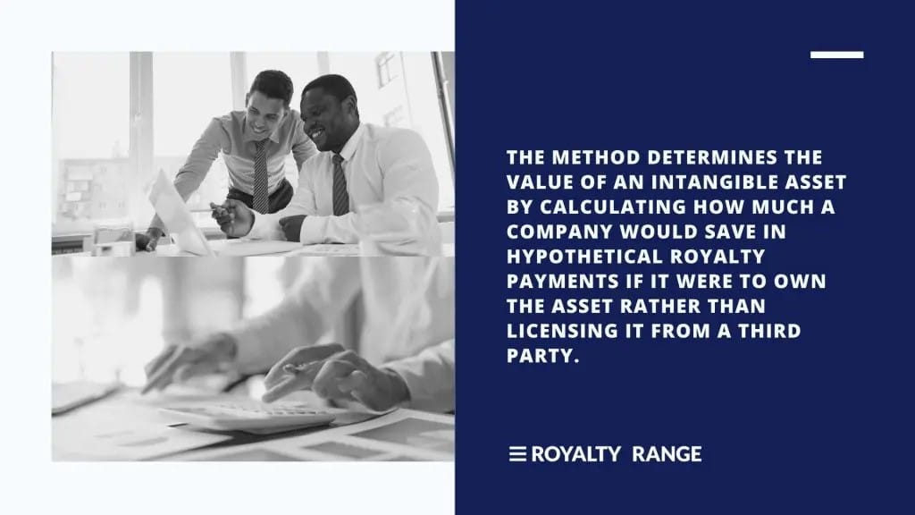 The method determines the value of an intangible asset by calculating how much a company would save in hypothetical royalty payments if it were to own the asset rather than licensing it from a third party. In other words, the value of the intangible asset is based on the costs that the company would avoid by not having to pay a license fee or royalty to use the asset.