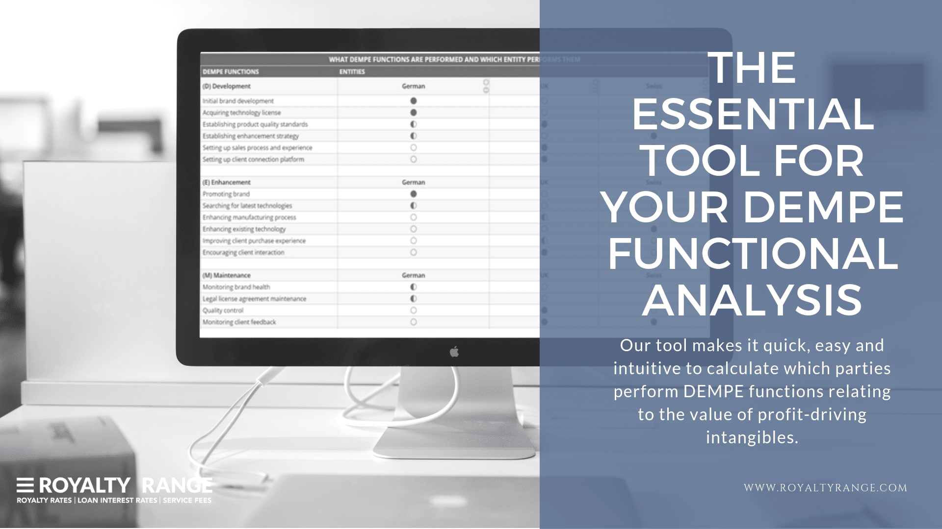 Our DEMPE analytics tool is a quick and easy way to get data for your functional analysis. It takes complex calculations off your hands and provides you with accurate, insightful results. Ready to try it yourself? Simply log in to your RoyaltyRange account and click on âDEMPE analyticsâ in the menu bar.